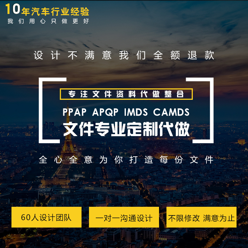 專(zhuān)精于五金件、注塑件、緊固件,特殊加工零件,汽車(chē)零部件等產(chǎn)品的PPAP、IMDS、CAMDS、FMEA、8D報(bào)告等技術(shù)文件輔導(dǎo)制作服務(wù)。